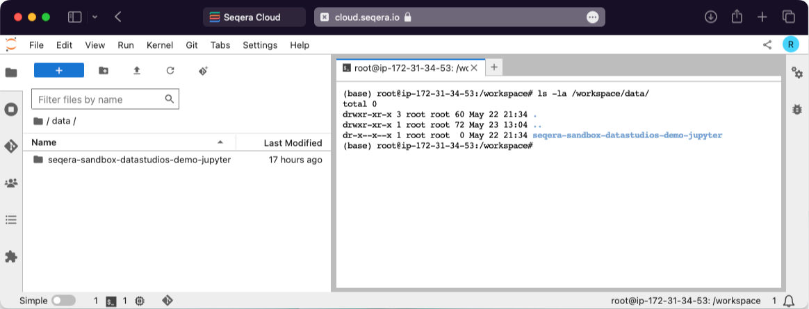 In your interactive analysis environment, open a new terminal and type ls -la /workspace/data. This displays all the mounted datasets available in the current session.